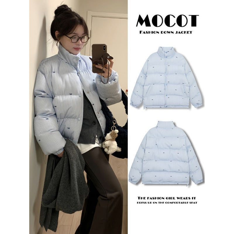 Crafted with premium thick cotton padding, it keeps you cozy without feeling bulky. The striped bow detail adds a playful and trendy touch, giving your outfit a modern Korean-Japanese aesthetic. Its versatile cut allows you to pair it effortlessly with jeans, skirts, or leggings for casual outings, office wear, or travel adventures. 🌸💃