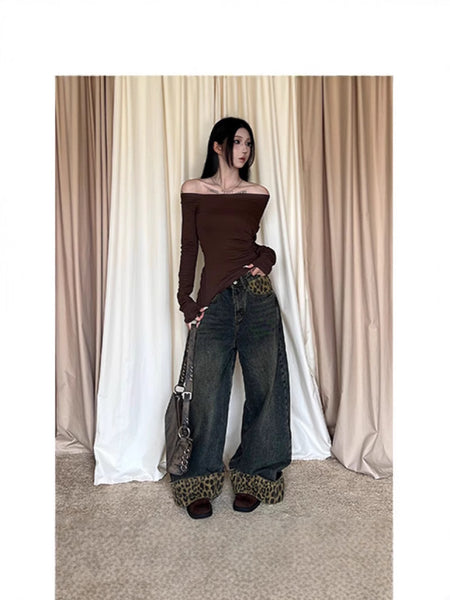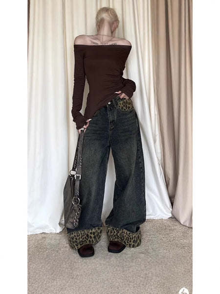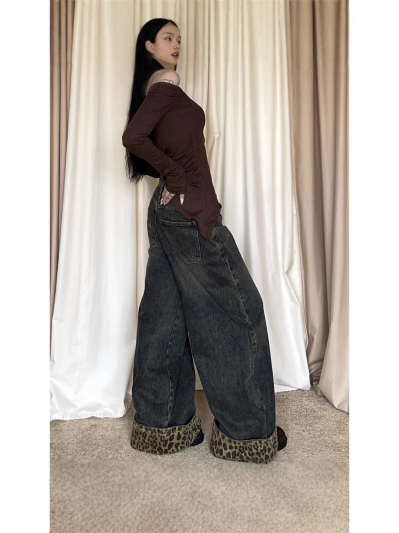 American Retro Leopard Hem Wide-Leg Jeans for Women
