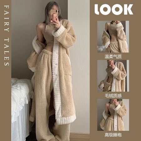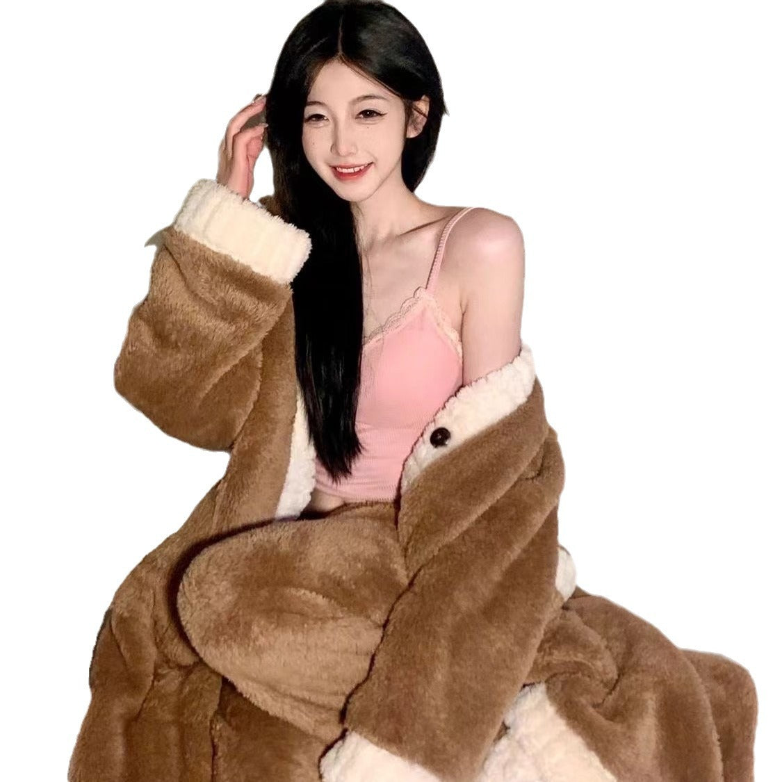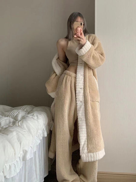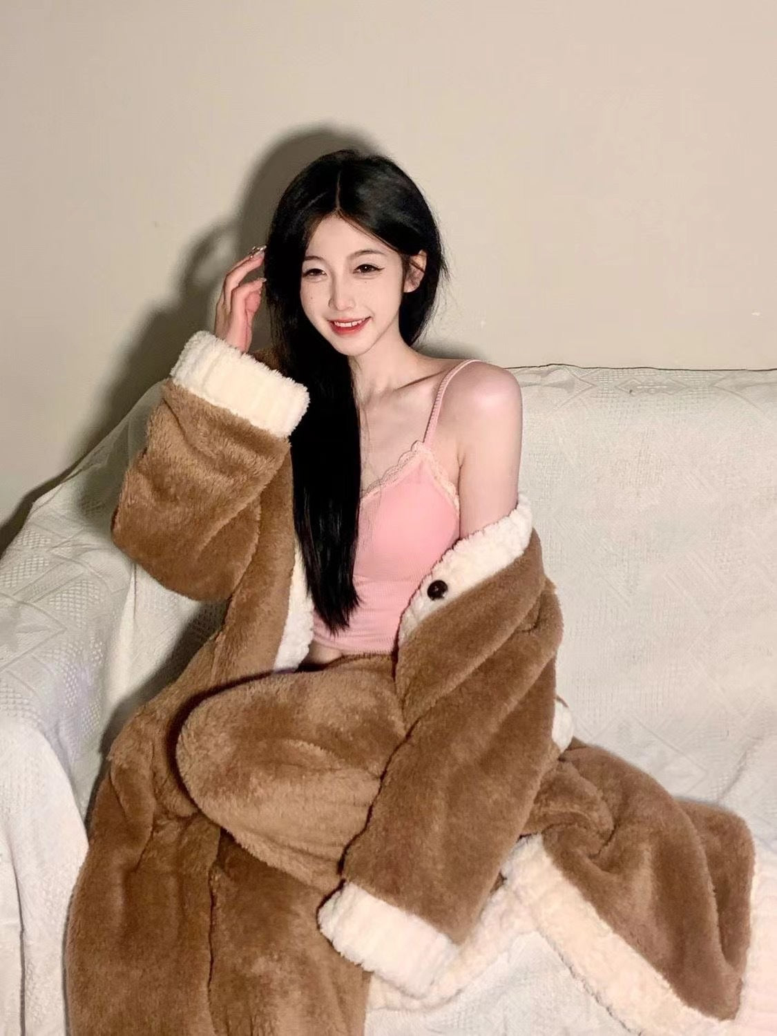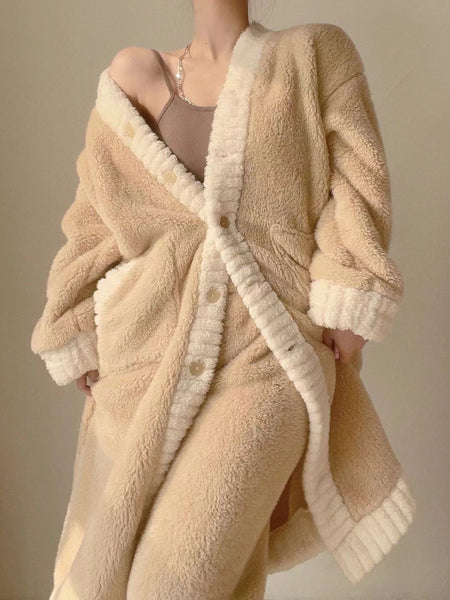 Crafted from premium coral fleece, the set includes a nightgown-style top and matching trousers, ensuring full-body warmth while maintaining a soft, plush feel. Perfect for cold days, relaxing indoors, or casual home activities 👩💼💖.