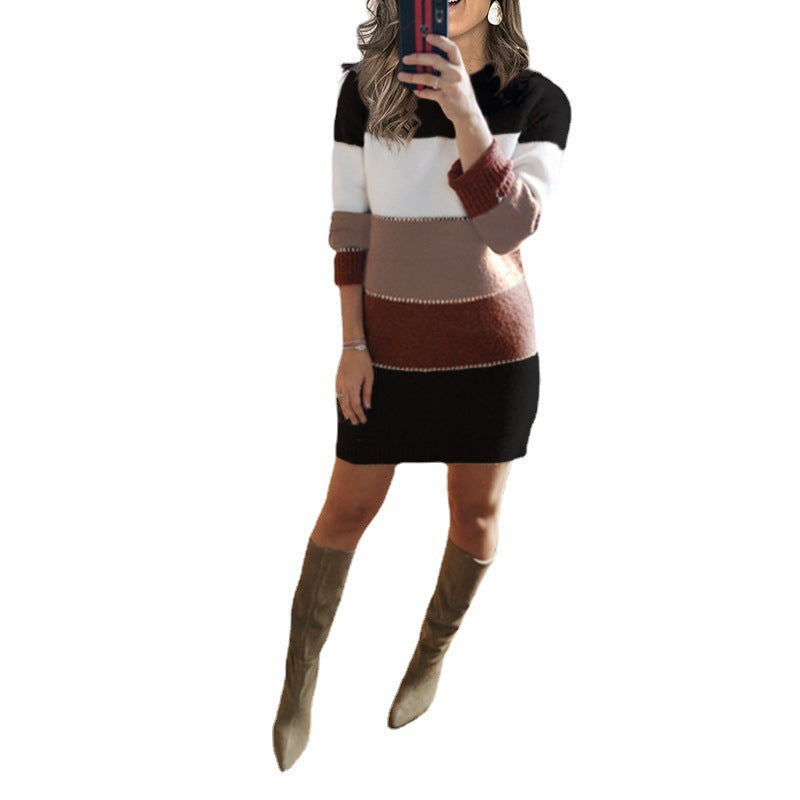 Autumn-Winter Knit Sweater Dress 🍁. Featuring a solid color body with stylish contrast stitching, this dress combines comfort, warmth, and casual sophistication. The round neck design and soft knitted fabric make it perfect for layering during chilly days, while the knitted skirt hem adds a touch of feminine charm.