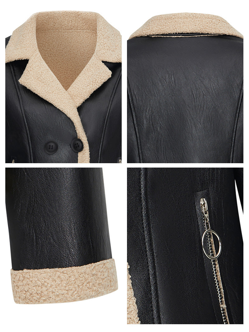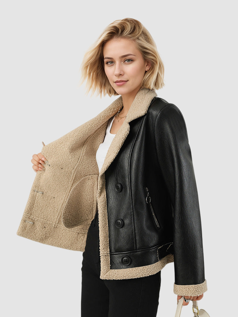 Fleece-Lined Turn-Down Collar Leather Jacket