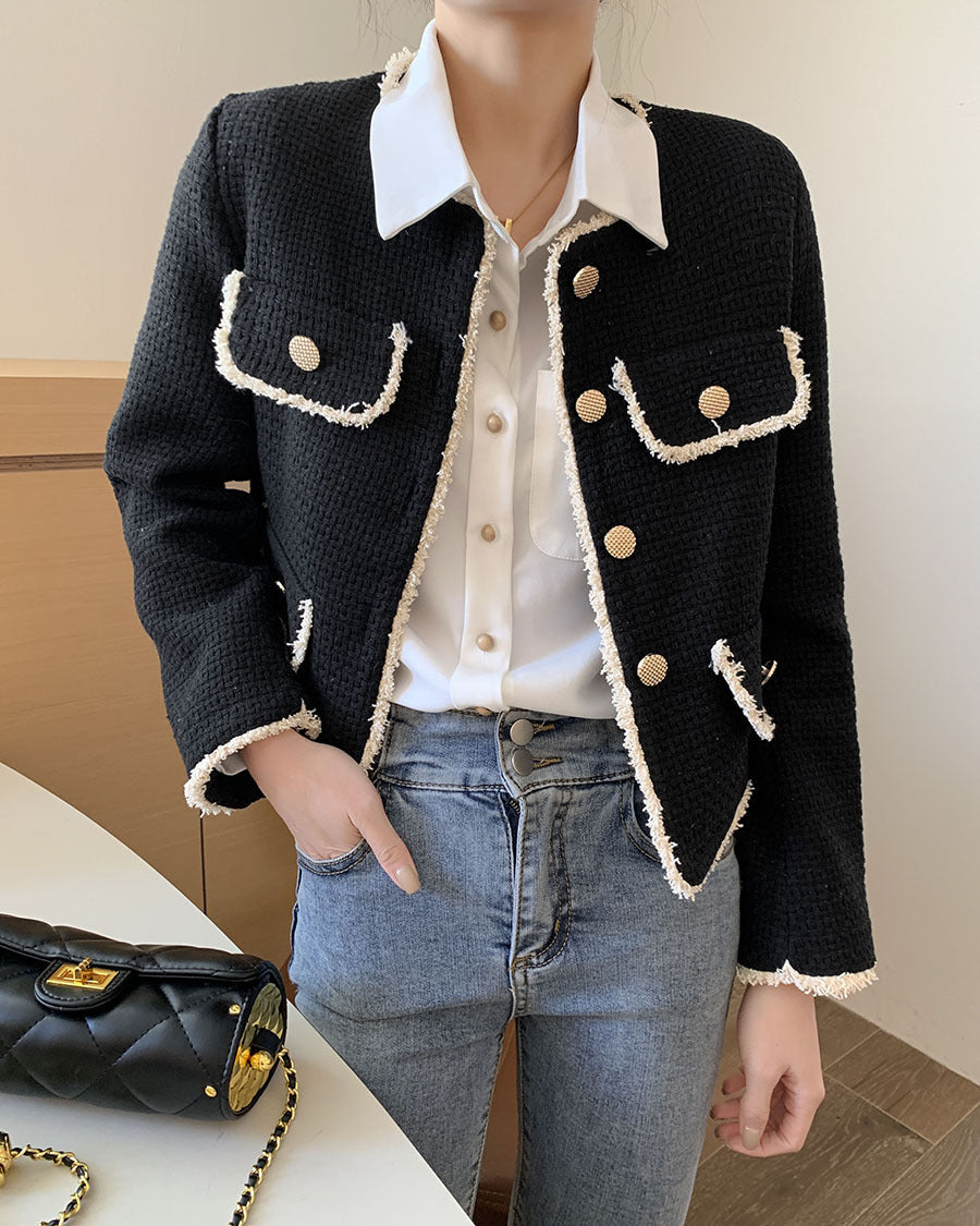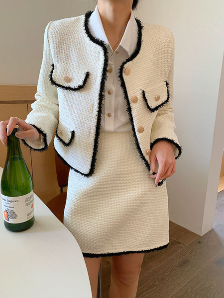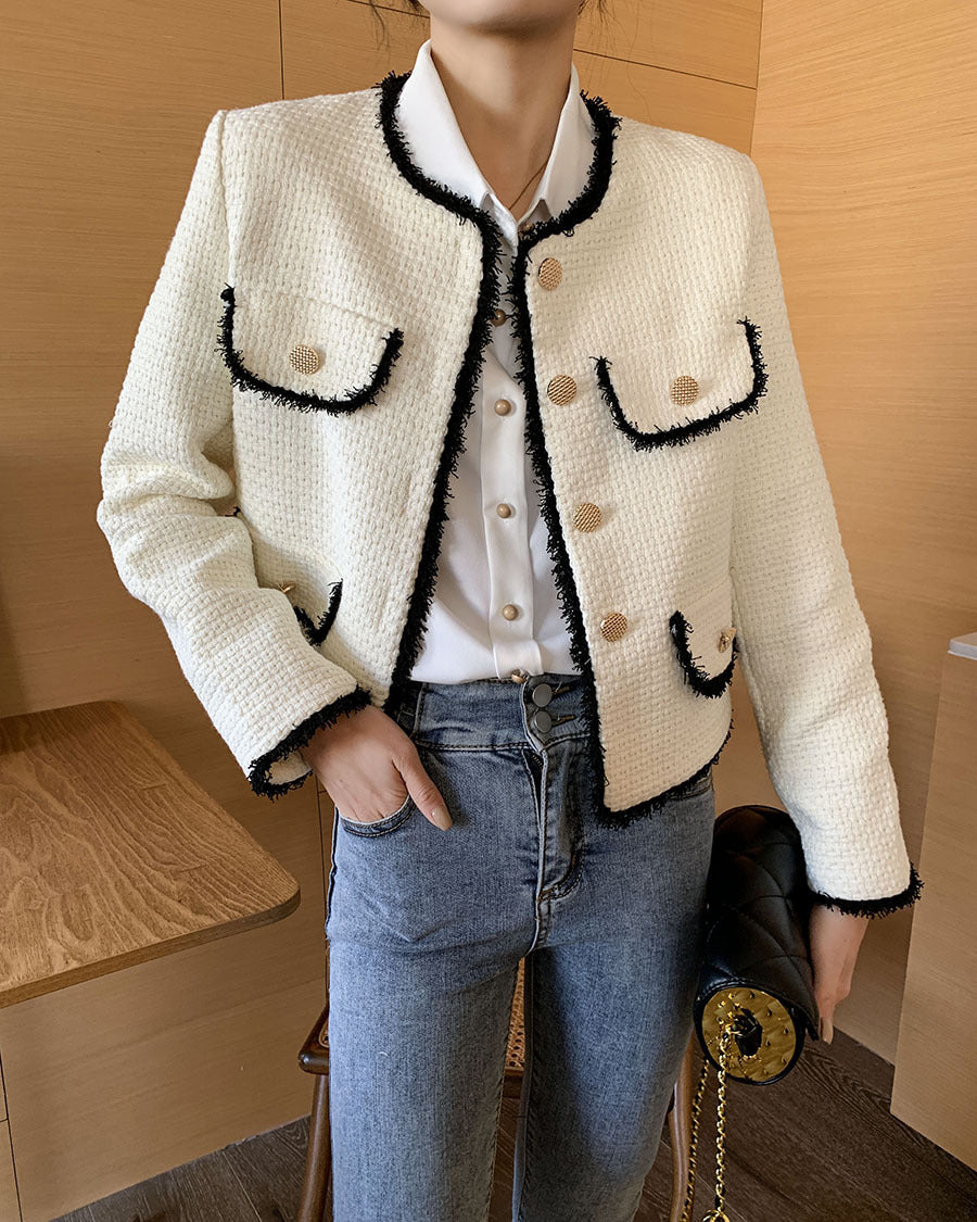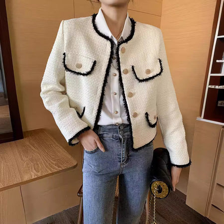 Designed for women who love classic socialite charm and polished fashion, this white short suit jacket combines luxurious tweed texture with chic tailoring, creating a refined and versatile wardrobe essential.