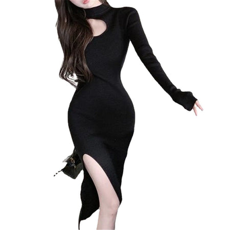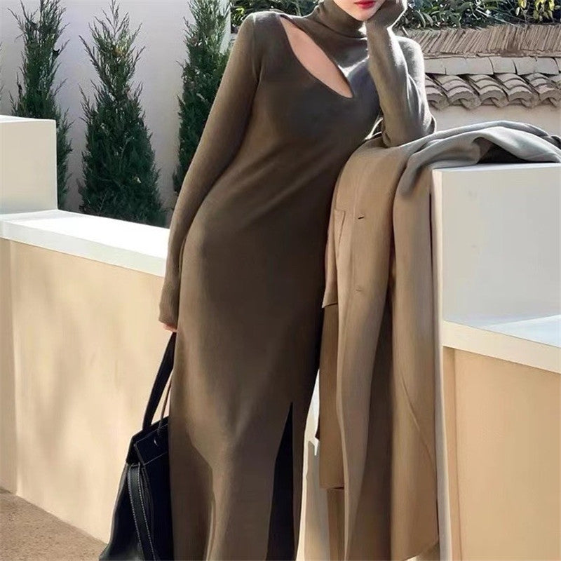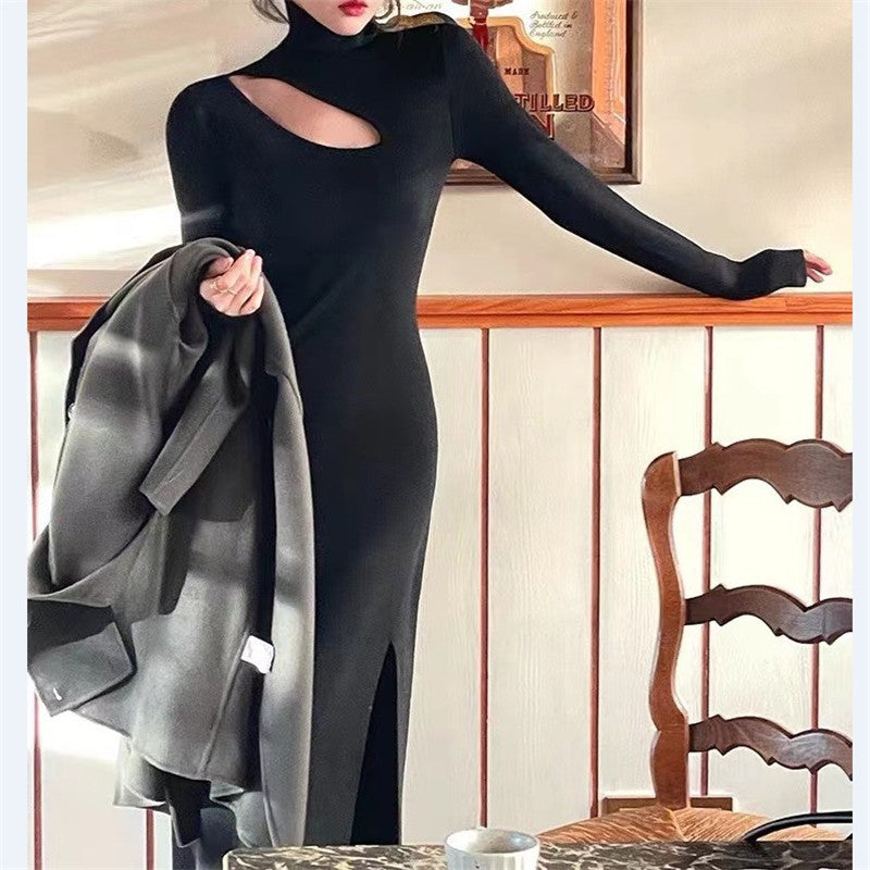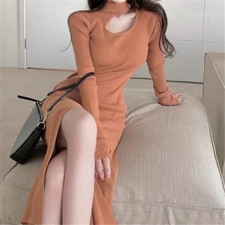 French hollow knitted sweater dress, designed for elegance and subtle allure. Featuring a high-waist silhouette and a sexy split sheath bottom, this dress blends sophistication with a touch of flirtiness. 🍂✨