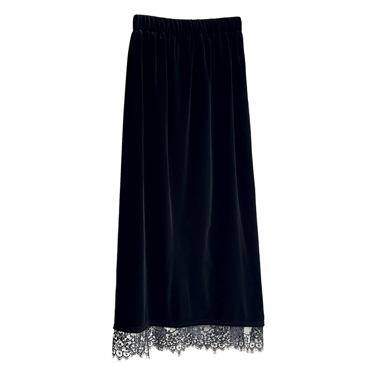 Chic and elegant, this Velvet Lace Midi Skirt adds French-inspired sophistication to your autumn and winter wardrobe. With its lace splicing, sleek velvet texture, and side slit, it’s the perfect blend of classic charm and modern femininity.