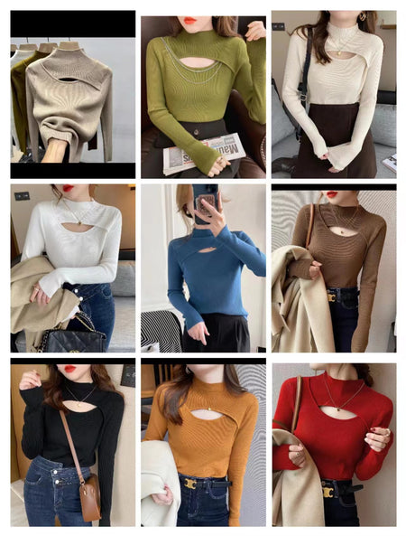 Crafted with soft, high-quality yarn, it feels gentle against the skin while keeping you warm during cooler months. The half-turtleneck design adds elegance and versatility, perfect for layering under jackets or wearing alone for a stylish statement. The unique cut-out detail gives a fashionable edge, making this top suitable for casual outings, office wear, or cozy indoor settings.
