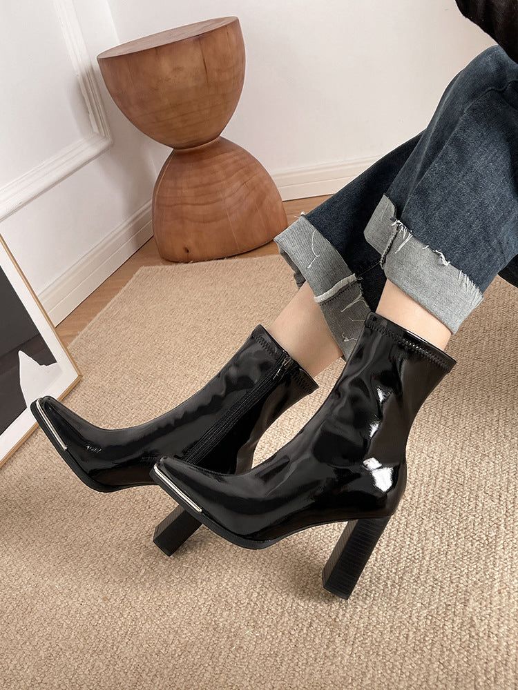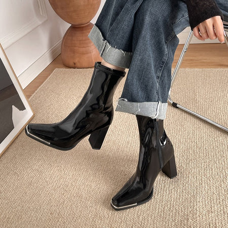 Crafted from premium patent leather, these boots are glossy, eye-catching, and easy to pair with any outfit 🌸. The thick heel and square toe provide both stability and sophistication, while the slim, low-top design offers a flattering fit for all-day wear. Ideal for city walks, casual outings, or semi-formal occasions, these boots elevate your style effortlessly 🌿.