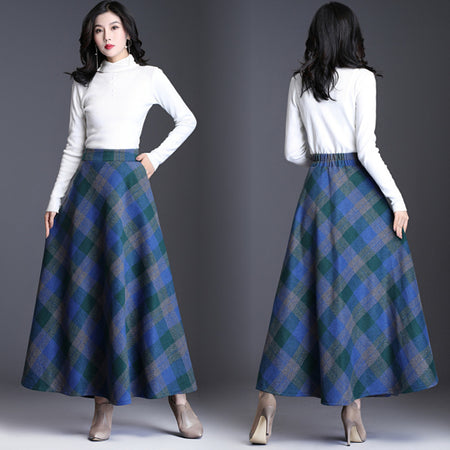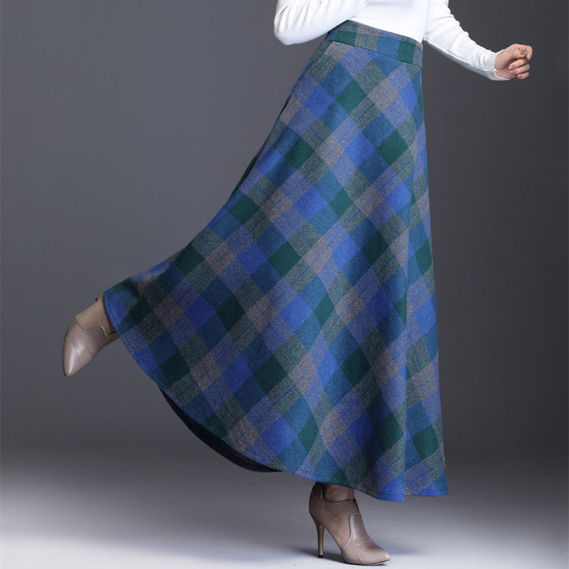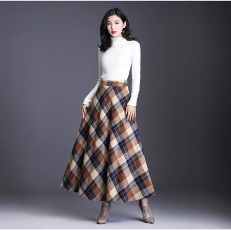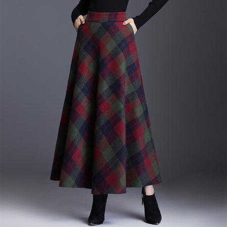 Retro Woolen Plaid Midi Skirt High Waist A-Line