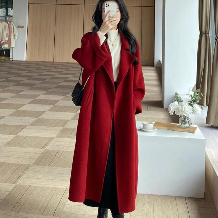 Its mid-length cut flatters every figure while providing excellent warmth. The loose, elegant design layers easily over sweaters, dresses, or office wear, making it versatile for both casual outings and formal events. The vibrant red adds a bold yet graceful touch that turns heads wherever she goes.