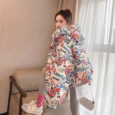 Made from high-quality white duck down, it ensures lightweight insulation while keeping you comfortably warm during chilly autumn and winter days. The small printed pattern adds a playful touch, and the hooded design offers extra protection against wind and cold 🌬️🌸.
