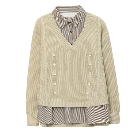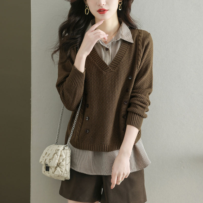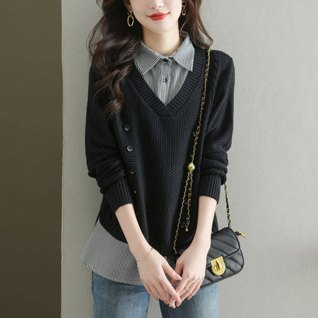 This sweater shirt is ideal for casual outings, office wear, or layering under coats and jackets, providing both style and comfort. The lightweight knit and clever two-piece illusion make it a go-to choice for effortless, fashionable layering.