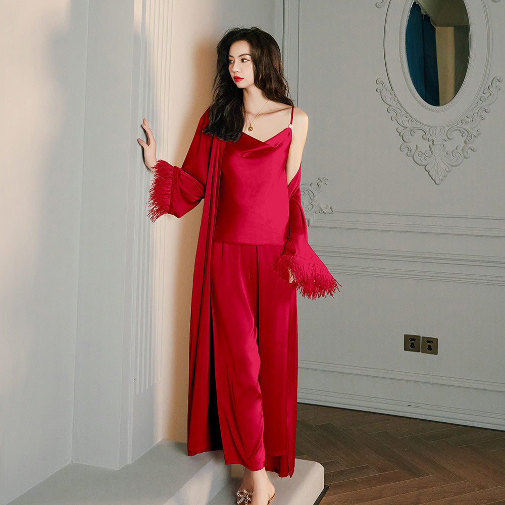 Yaoting Ice Silk Pajama Set β Satin Feather Nightgown & Trousers