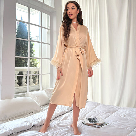 Indulge in ultimate luxury with the Yaoting Ice Silk Pajama Set πβ¨. Designed for summer, this set features a long sleeve satin nightgown with feather accents and matching sling trousers. The smooth, cooling ice silk fabric ensures you stay comfortable and chic during warm nights, while the feather details add a touch of elegance and style.